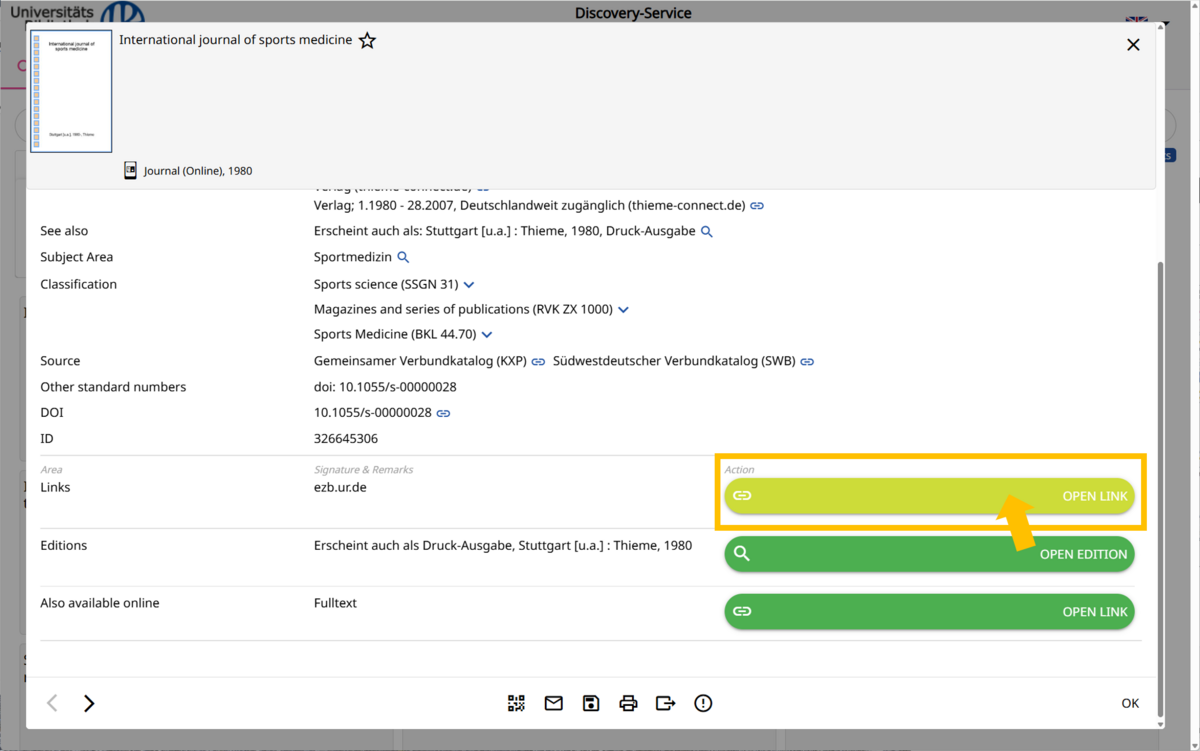 This page contains information about the e-journal. Clicking on the light green box will take you to the electronic journal library (EZB) page. Clicking on the green “Open edition” box will take you to the print edition of the journal. Clicking on the green “Open link” box will take you directly to the publisher's website.
