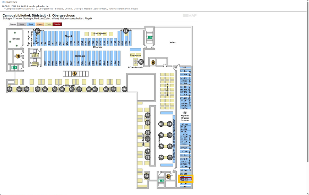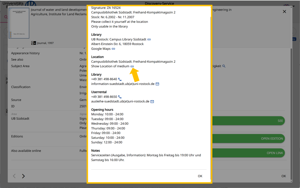 "Location" explains that the journal is in the compact shelving-2 on the second floor of the Campus Library Südstadt "(Campusbibliothek Südstadt: Freihand-Kompaktmagazin 2). Click on the blue link icon next to "Show Location of medium" to view the journal's physical location.