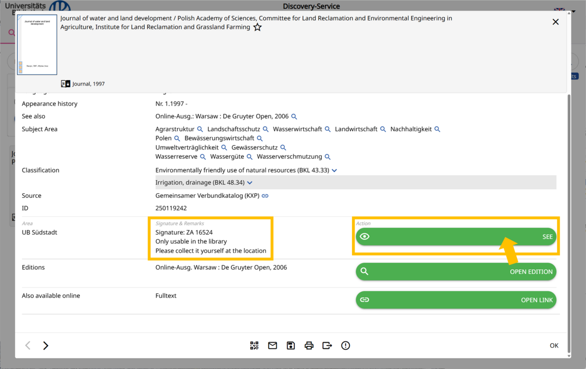 The title page shows that the journal is located at Campus Library Südstadt, under Shelf mark ZA 16524. Click on the green box “See” to see information about the library.