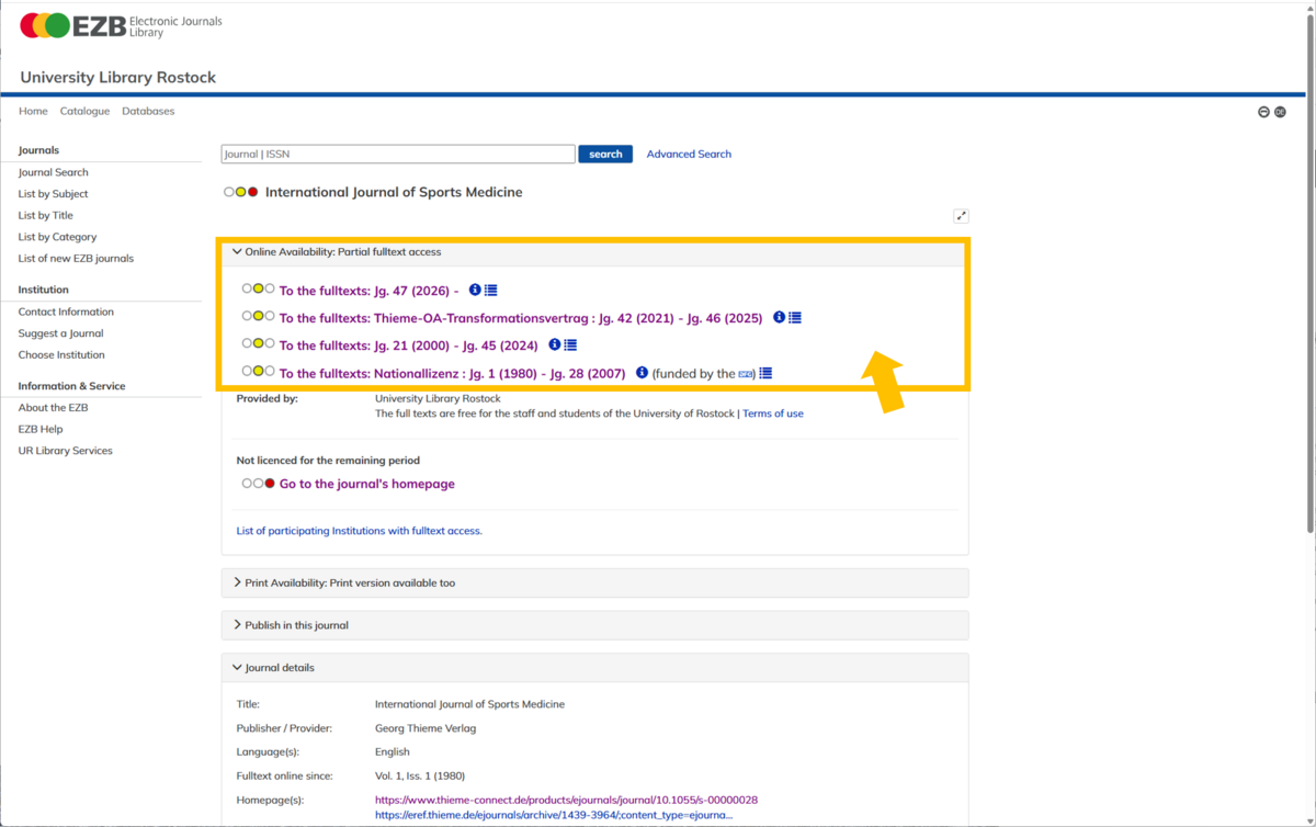 The title page in EZB shows, via colour-coding, whether Rostock University Library has access to the e-journal. In this example, the journal is "yellow" – therefore, licensed. You can access it on a PC at Rostock University Library or, as a member of the University of Rostock, via eduroam or VPN. Please note: You can switch the language to English in the top right corner of the EZB website.